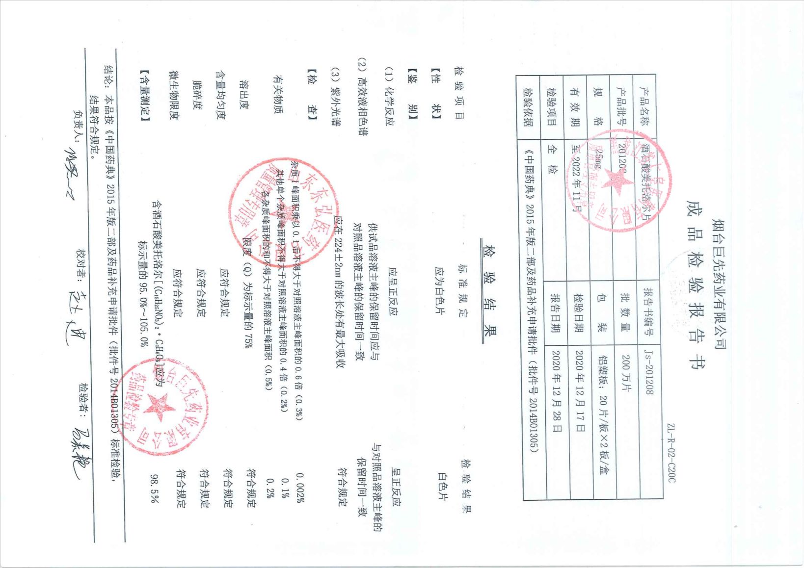 酒石酸美托洛尔片20