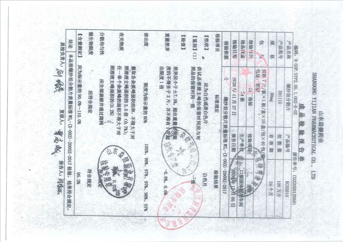 缬沙坦分散片2011