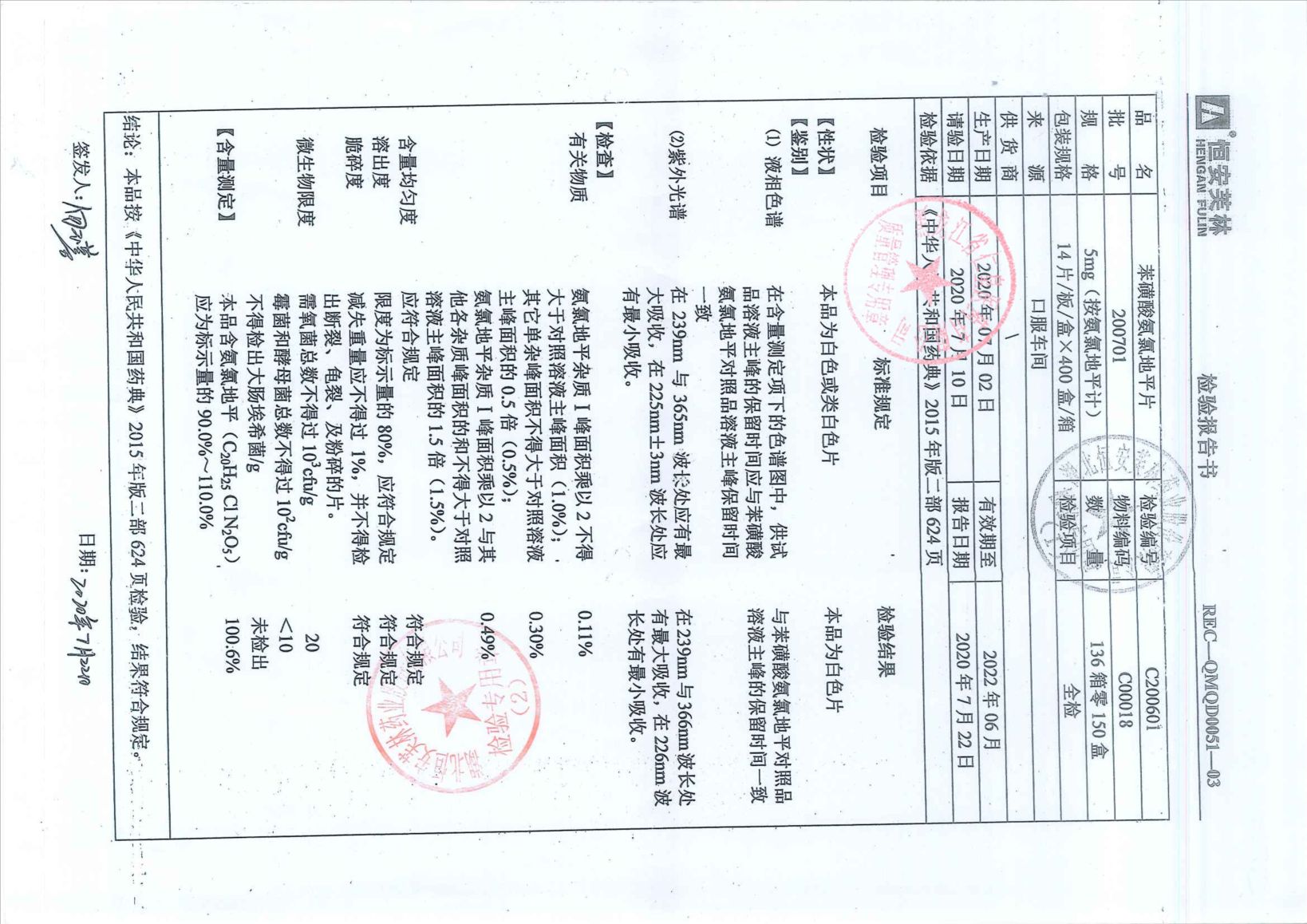 苯磺酸氨氯地平片20