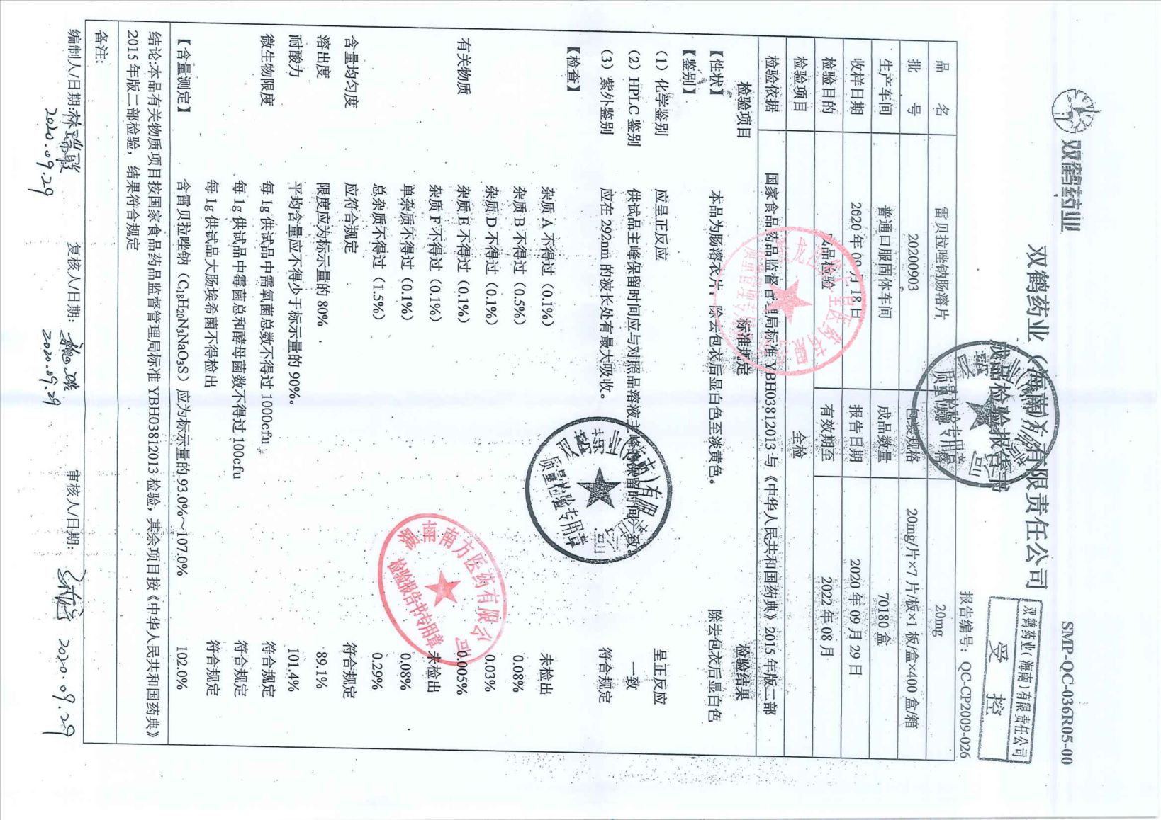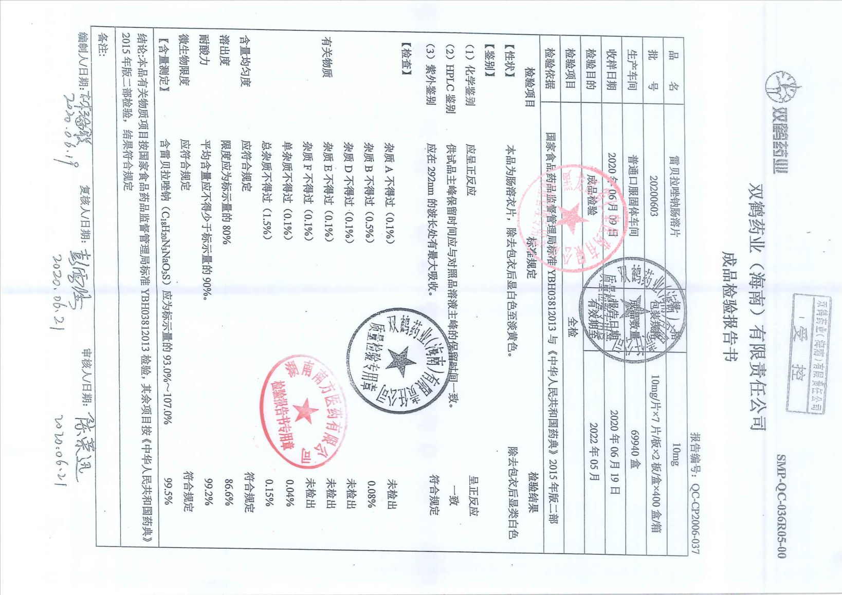 雷贝拉唑钠肠溶片20