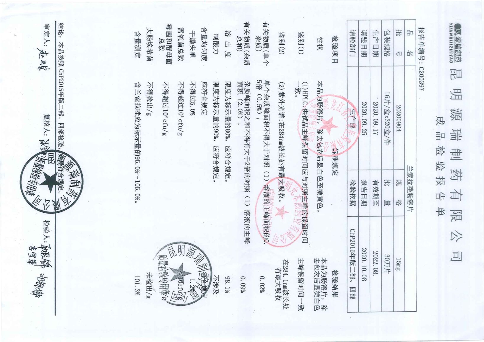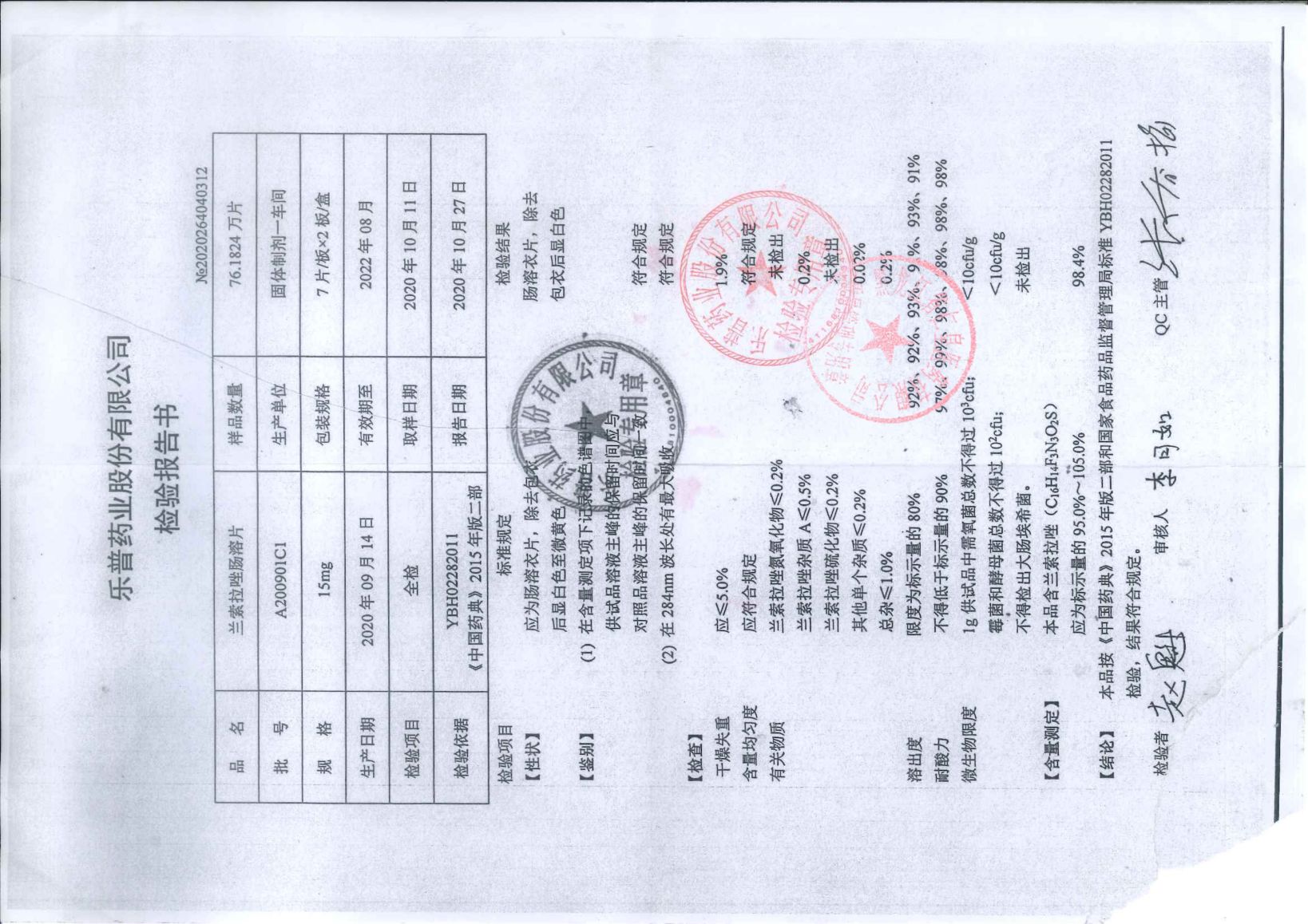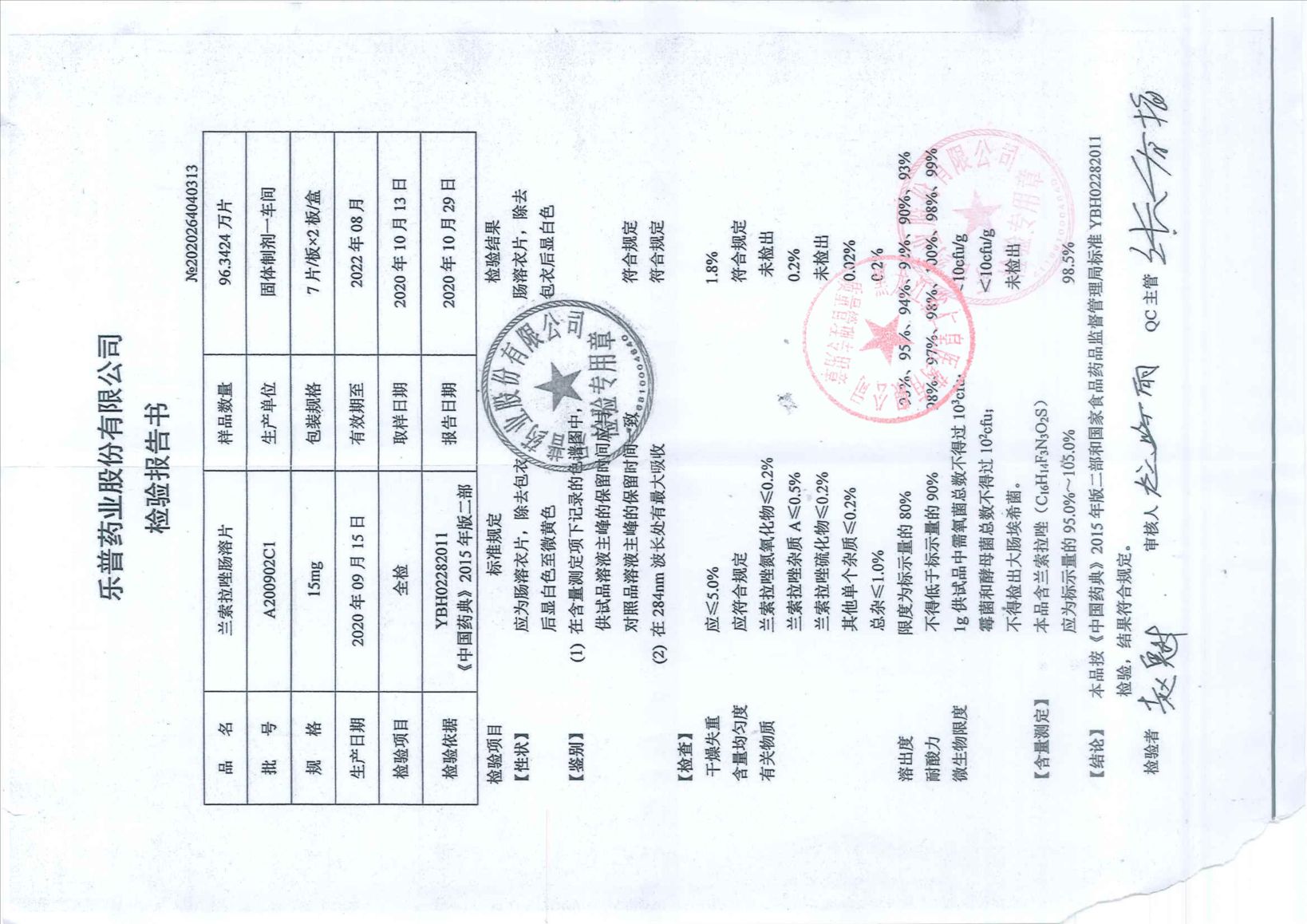 兰索拉唑肠溶片202