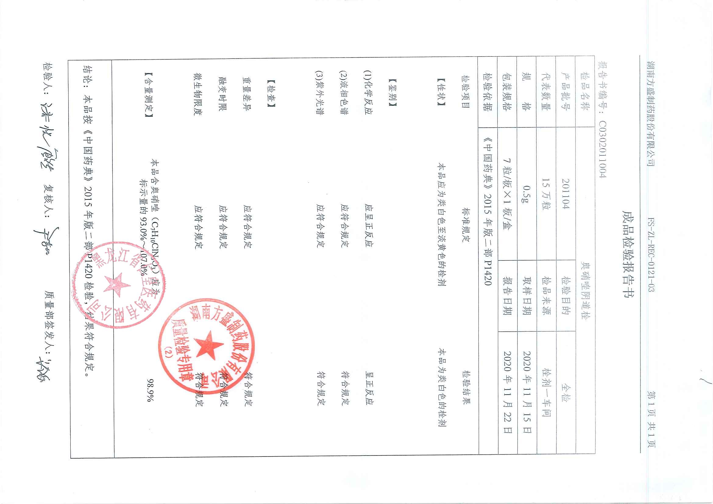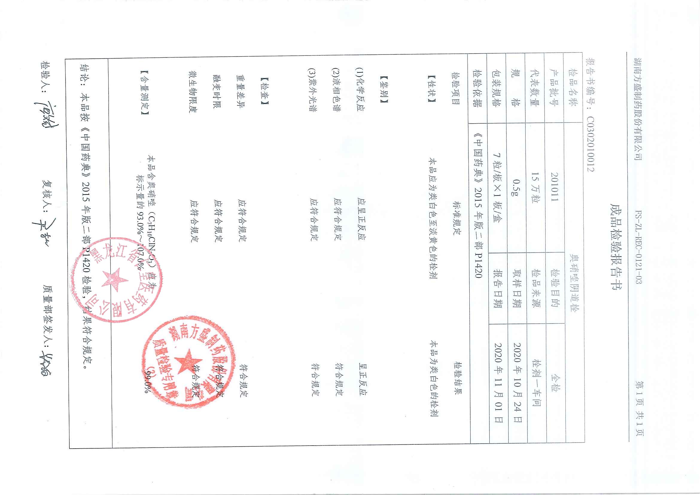 奥硝唑阴道栓2011
