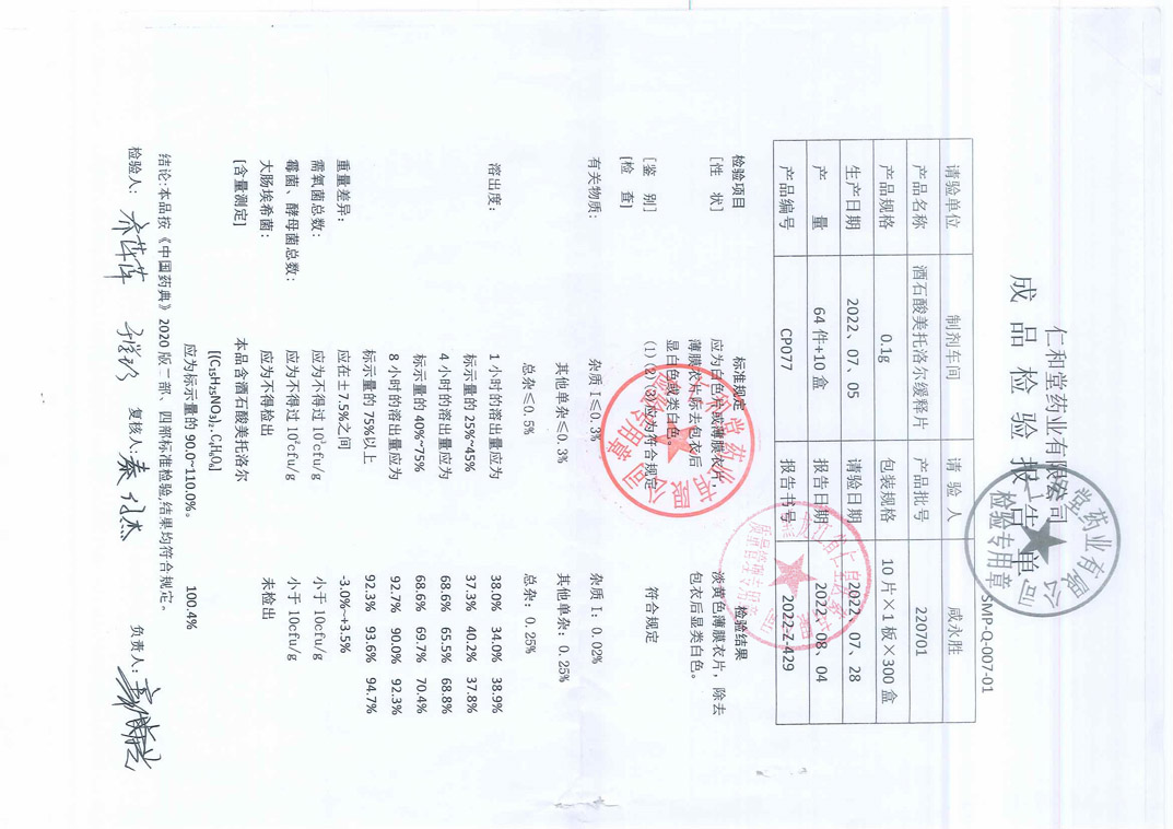 酒石酸美托洛尔缓释片