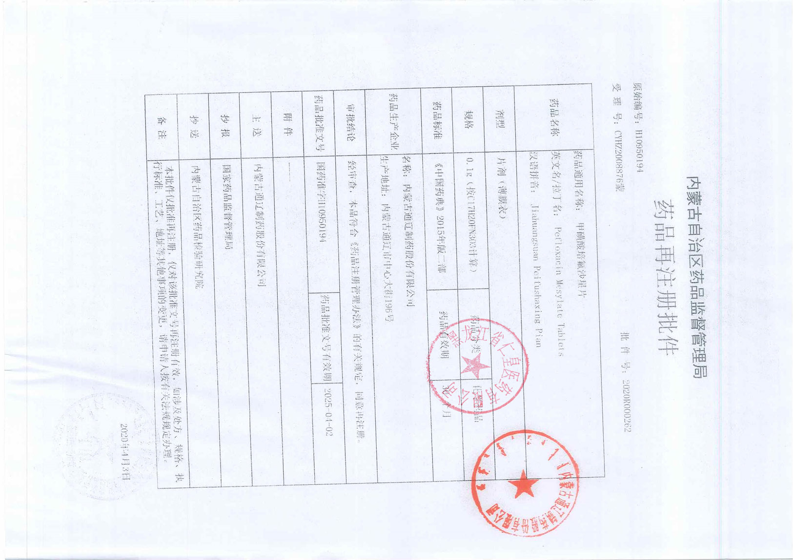 甲磺酸培氟沙星片内蒙